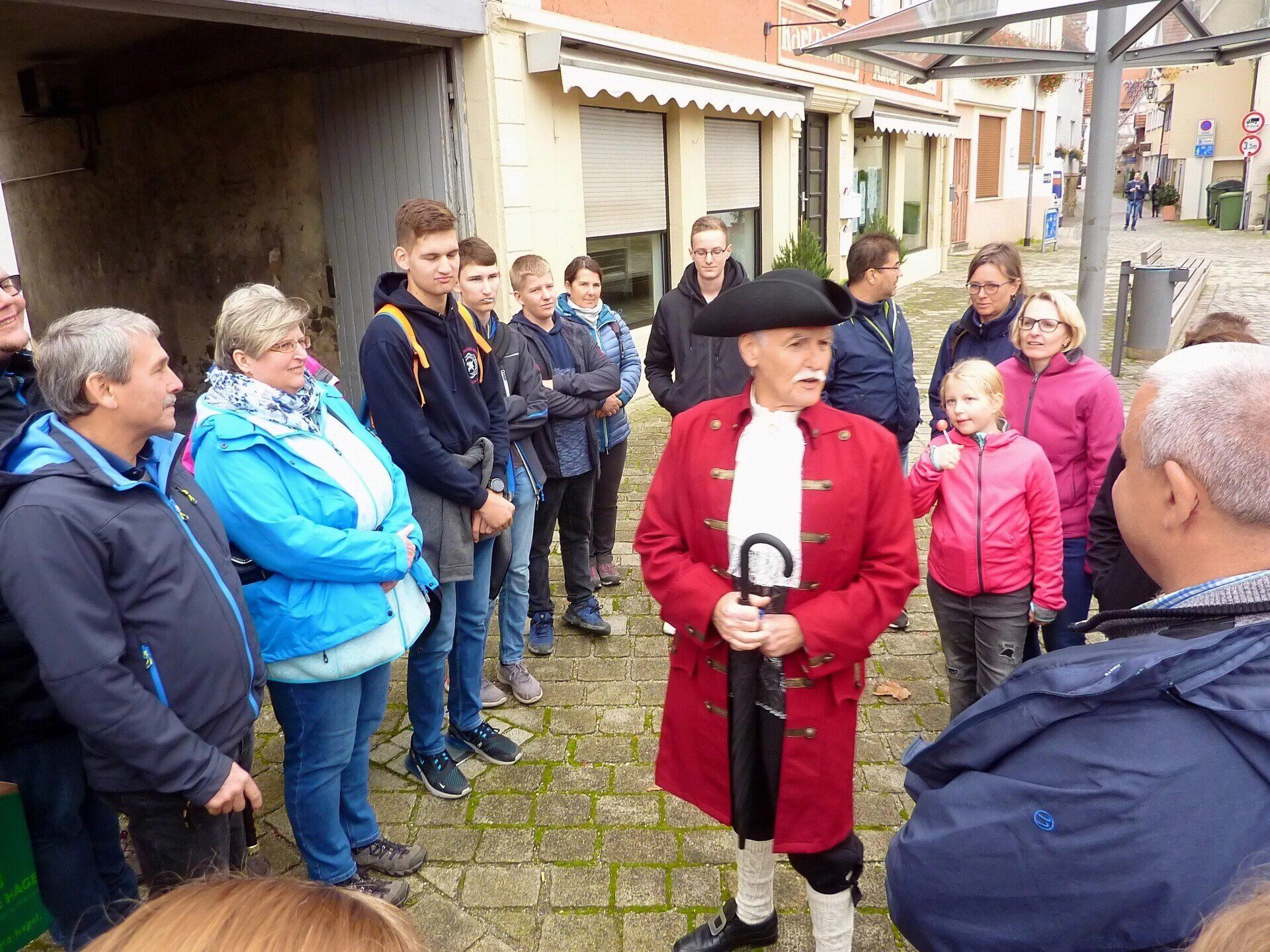 Frisch gestärkt wurde die Wanderung anschließend zur Altstadt Besigheim fortgesetzt. Am Fuß des mächtigen Waldhornturms empfing uns der Stadtführer Ewald Anger, der uns als Vogt Essich mit seinem fundierten Fachwissen sehr kurzweilig vieles über die Stadtgeschichte von Besigheim erzählte. Auch wenn zwischenzeitlich Regen einsetzte, trübte es nicht die gute Stimmung. Über die Entengasse führte uns der Weg zum ehemaligen Besigheimer Krankenhaus, zum Rathaus und über die Finstere Gasse weiter zum Haus des Vogts Essich (heutige Förderschule). Krönender Abschluss war die Besichtigung der Stadtkirche mit dem um 1520 erschaffenen spätgotischen Schnitzaltar. Den eigentlichen Abschluss der Stadtführung bildete jedoch der Besuch des Steinhauses. Wer wollte konnte schließlich noch den Waldhornturm besteigen und die einmalige Aussicht auf Besigheim und die Umgebung genießen.